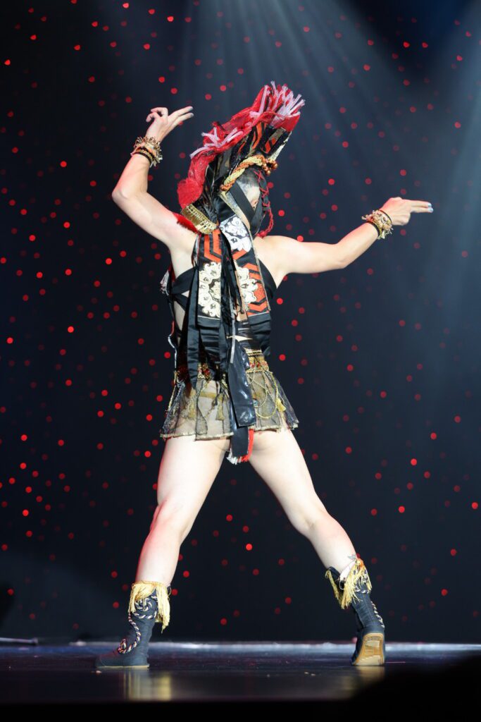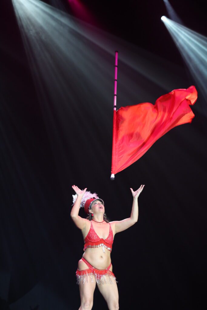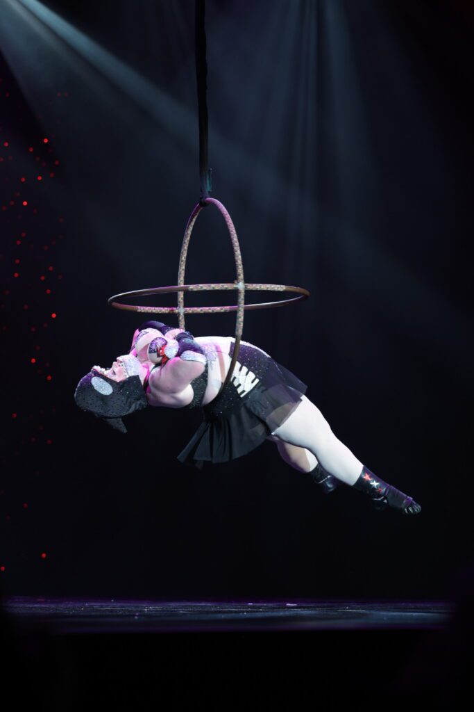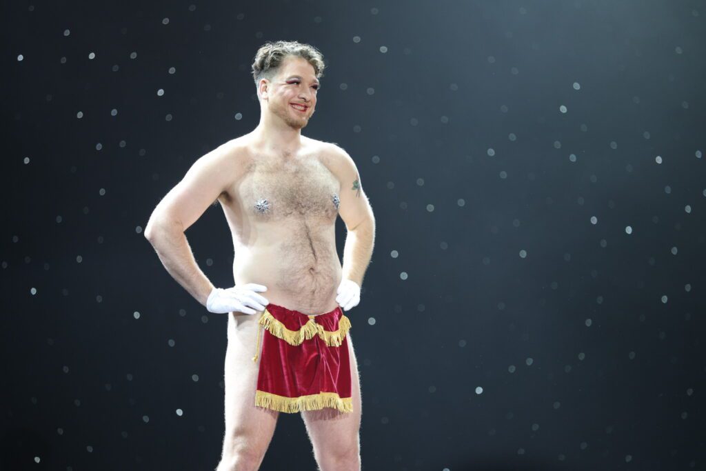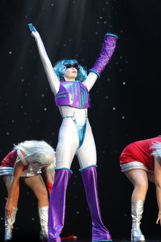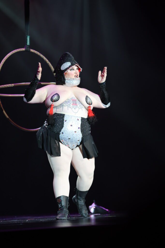 Surprise! It’s MEW ’19 Frankie Fictitious atop a deconstructed, betwinkled motorcycle, revolving nonchalantly to ACDC in blood-red beaded scanties, before dropping, oh so casually into a split and fixing us with her white tiger eyes. Rawrr.