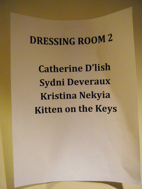 3:30pm: And it’s my tech time… I almost get lost in the casino. David Bishop (“The Bishop of Burlesque”) greets me warmly and shows me my dressing room – I can’t tell you how excited I was to see who I was sharing a room with! I was greeted by the always effervescent Kitten on the Keys getting all of her things prepared for the night.